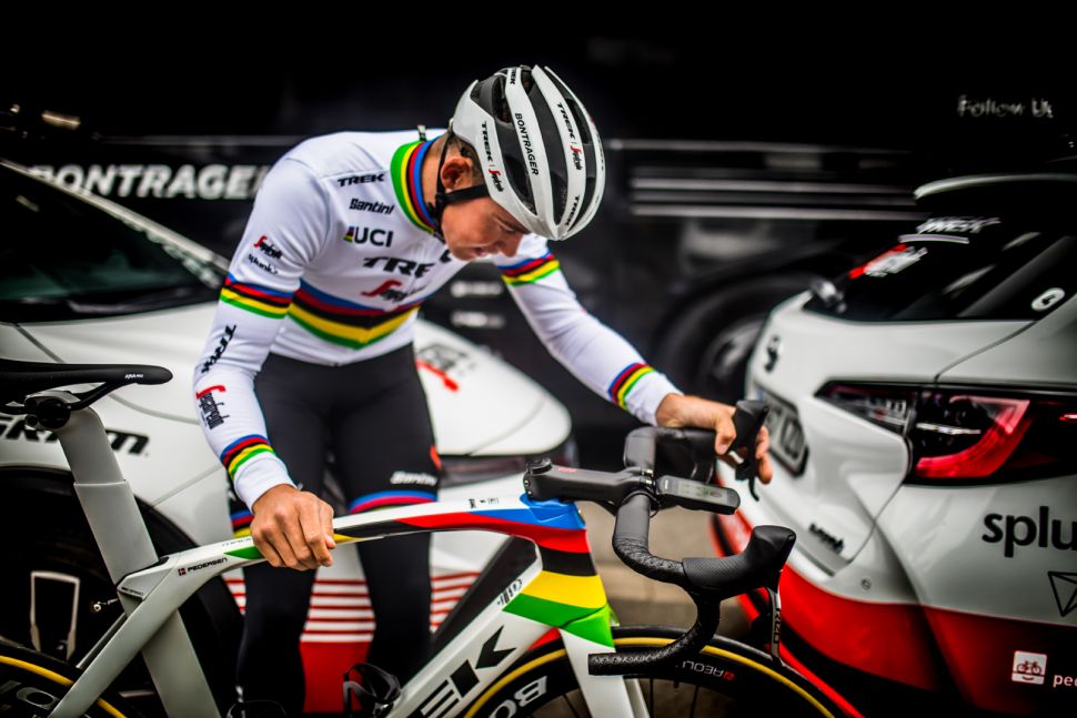 像其他厂商一样,Trek也为自家赞助的车手提供了世界冠军涂装。在去年赢下世锦赛的小将,彼德森使用的便是Madone车架。在这款定制涂装的战车上,头管、上管部分印着UCI标志里的五色条纹,车架底色是靓眼的白色,与世界冠军衫的搭配非常和谐。并且,车子的链条也被做了涂装,同样是世界冠军独享的彩虹喷涂,非常华丽。