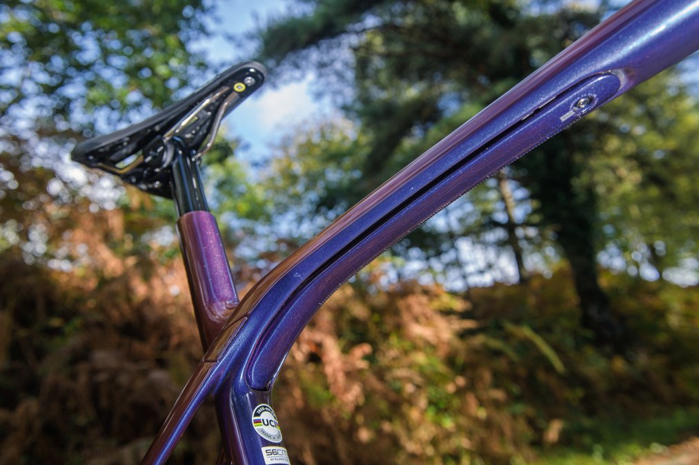 为了让车架更有特色,也为了增加在鹅卵石路上的辨识度,Domane推出了近年流行的星空紫的配色。车架整体被紫色包裹,并且可以看到很多细小的,类似星辰的颗粒,配合外侧的光漆,在阳光下非常醒目。
