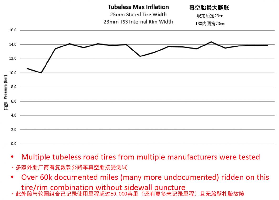 只有一个特例是在10 Bar/145psi的胎压下炸了,大部分的胎都能承受几乎200psi的胎压。鉴于大多数品牌的建议胎压都会比实际更低,比如ZIPP新款303 Firecrest轮组的最大推荐胎压是73psi,所以你不太可能因为胎压过大把胎从圈上崩掉。