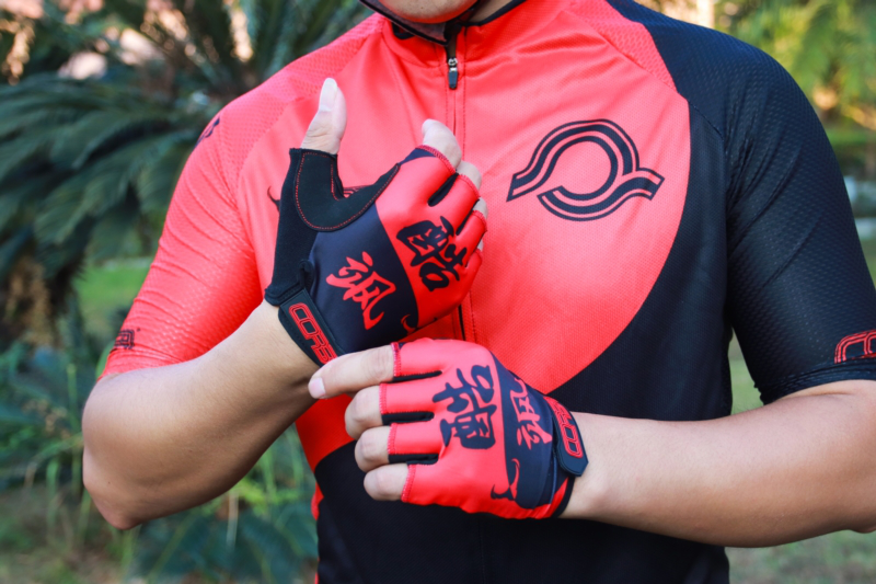 酷飒2021限定款半指手套采用了与乾坤骑行头盔相同风格的设计,黑红风的主色调搭配上双色牛头标以及“酷”“飒”俩字,看上去十分显眼。