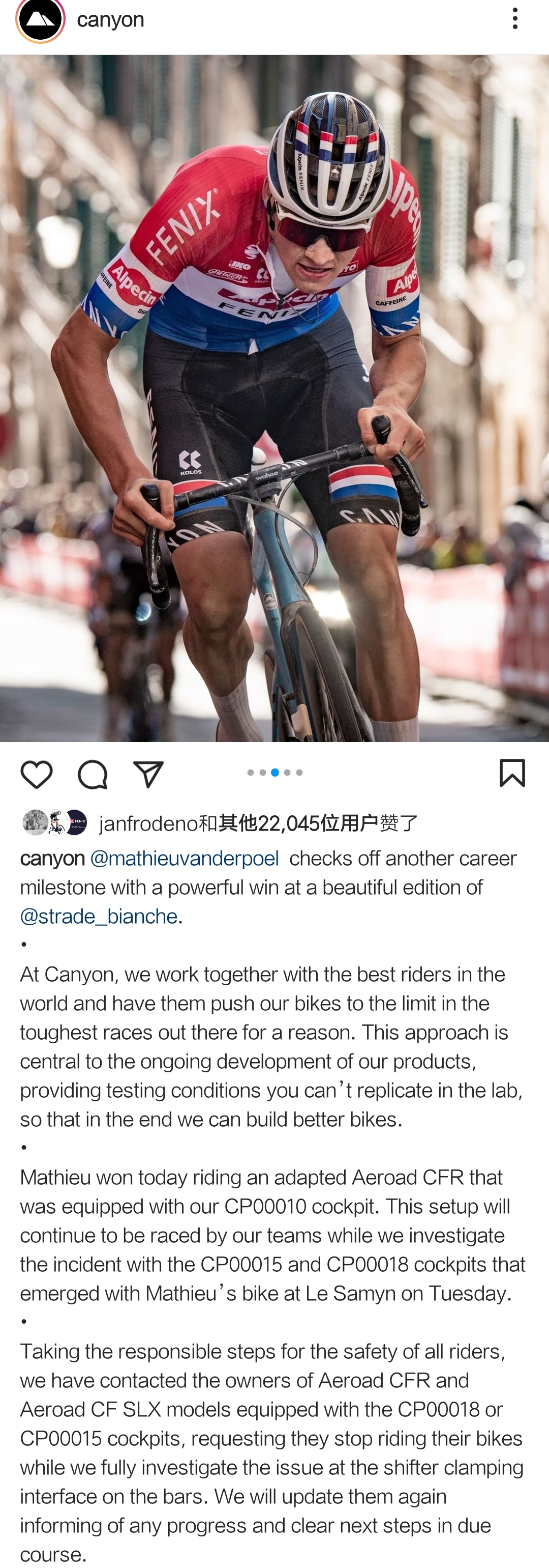 CANYON恭喜了范德普尔的胜利,同时也简单说明了他们的操作。彪哥在比赛中使用的车架仍然是CANYON AEROAD CFR,但是把组使用的是CANYON CP00010非全内走线的版本。所以前叉也有可能使用的是CF SL版本的非全内走线前叉或CFR前叉打孔改装。