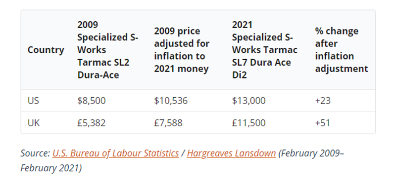 以下是将2021年的通货膨胀率调整到2021年的价格,并将其与当前同等价格的Dura-Ace R9100 Di2系列的Specialized Tarmac SL7的价格进行比较后得出的结果。
