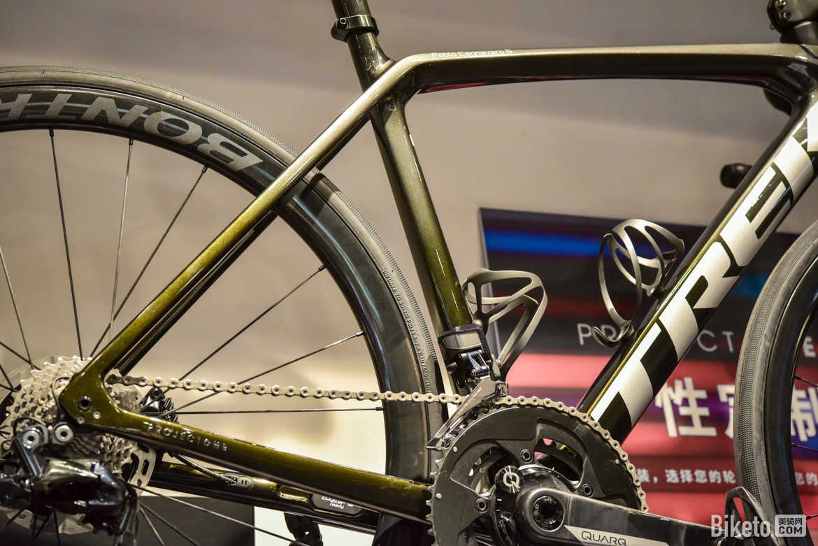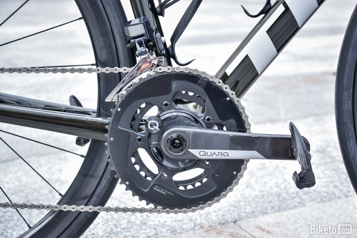 牙盘组是整车上为数不多的SRAM家产品,Quarq D1曲柄+新款Quarq AXS 功率计+旧款Red盘片,整体搭配还是非常好看的。考虑到现款Trek Emonda采用T47中轴,选择DUB轴心的曲柄可以获得很好的兼容性,购买合适的螺纹中轴也相对方便一些。