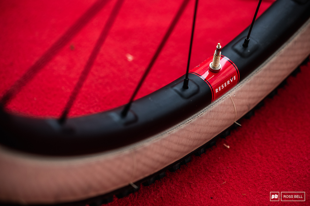 来自Santa Cruz FSA车队的28mm宽Reserve碳纤维轮组。