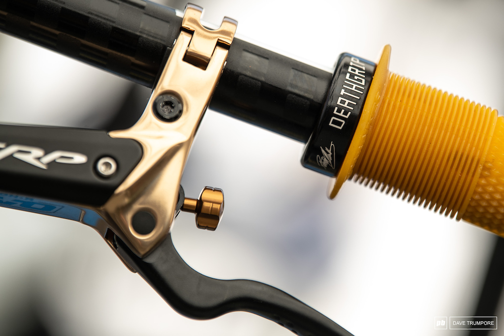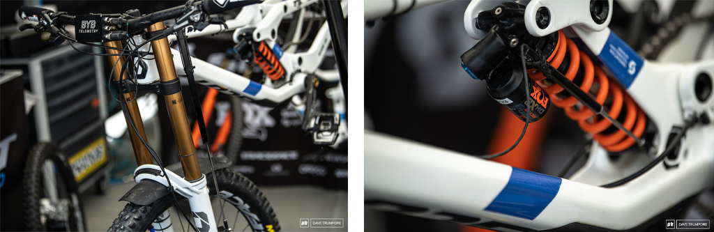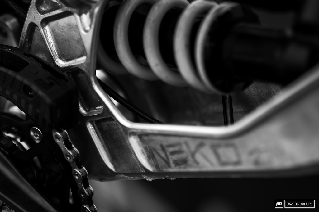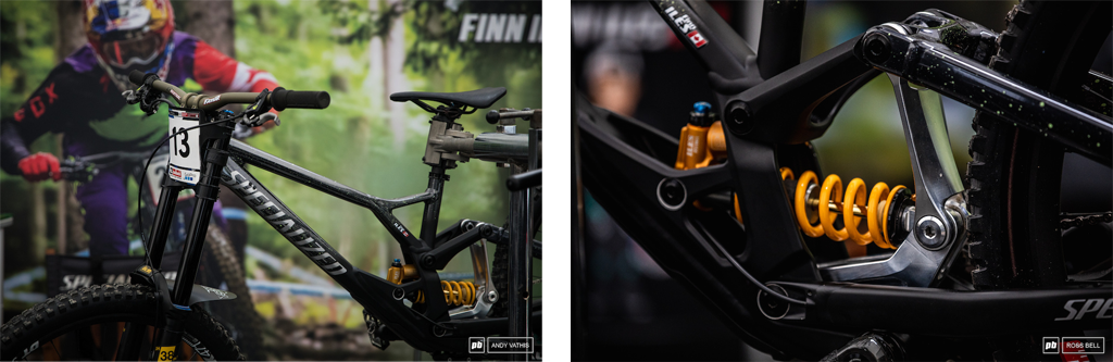 速降小将芬恩·艾尔斯(Finn Iles)的幸运数字是13,他的 Demo 涂上了漂亮的新车漆;一个原始的连杆设计在他的Specialized Demo上。