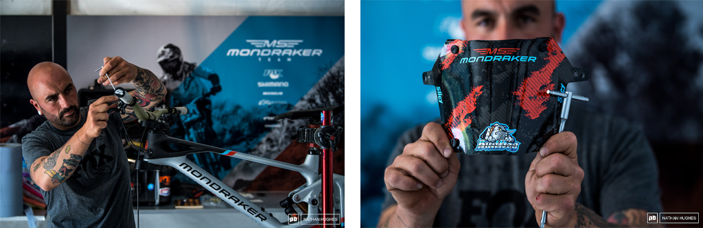 布鲁克·麦克唐纳的机械师贝努瓦在 MS 维修站将他的新碳纤维 Summum 固定在一起。Slicy 的新作品 ,使用 Benoit 输入开发的可定制车牌。