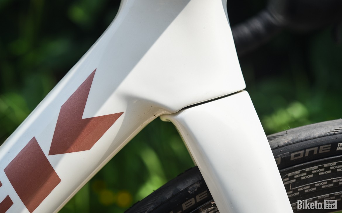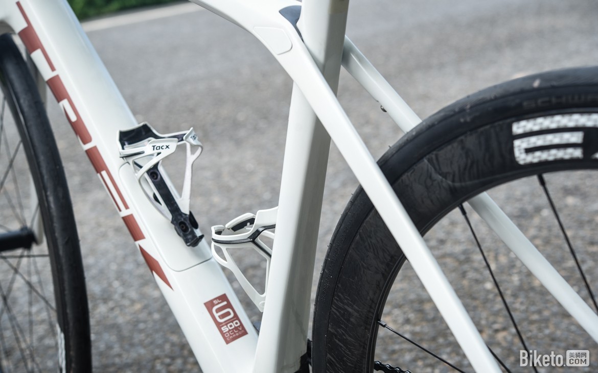 车架的配色比较特别,是小编选择这款涂装的原因之一。珍珠白配玫瑰金比较有气质,市面上常见的DOMANE SL不是白红就是红白,所以这款白金配色显得十分特别。但小编还是喜欢紫色的SL5车架,但无奈国内这款涂装的保有量实在太少了。