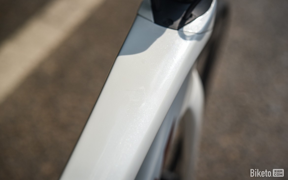 看似纯白的车架,其实是白色的珍珠漆,质感不错。新款DOMANE的上管非常粗壮,算是小编见过最粗的上管之一了,靠近头管的位置一手无法掌握。