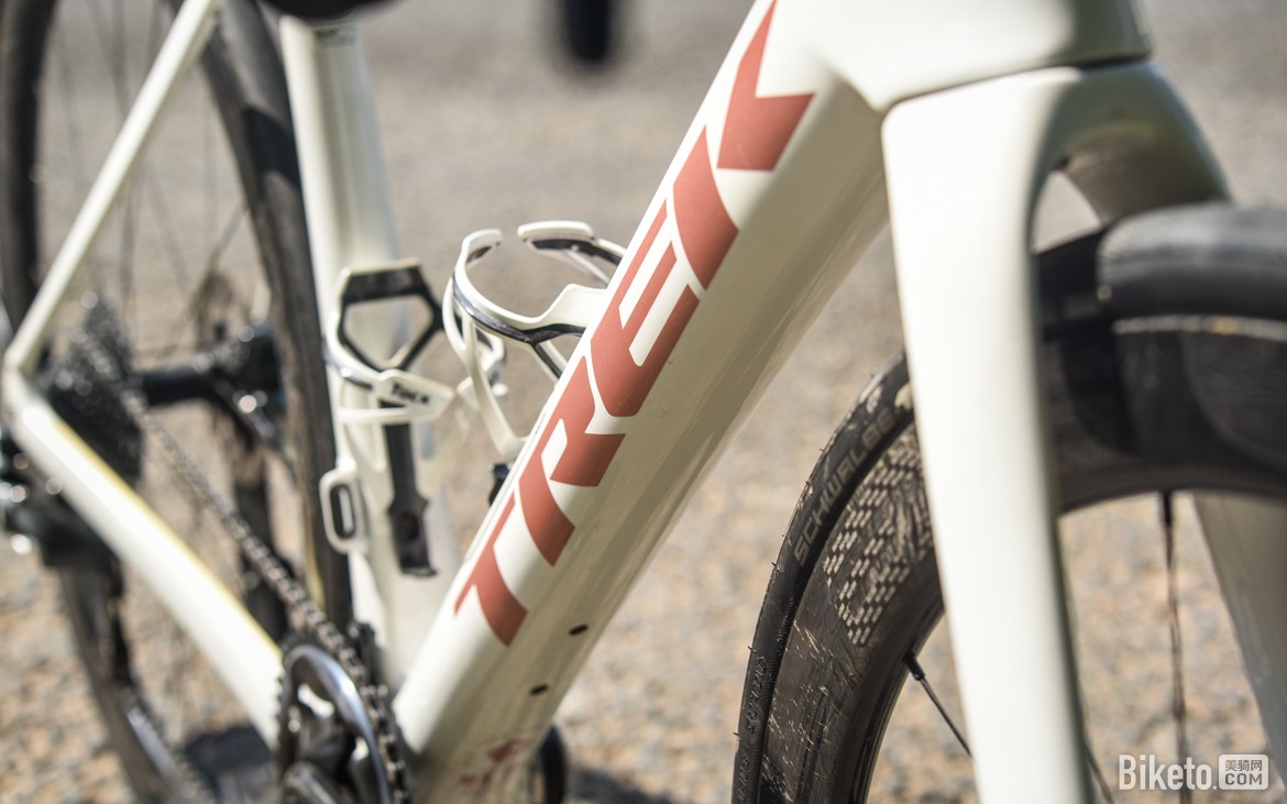 DOMANE SL的涂装都比较简洁,这支SL6车架只有下管上的Logo使用了玫瑰金色。