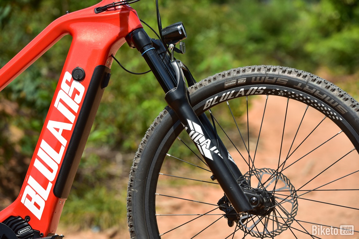 前叉依然是S6那款粗壮的140mm镁铝合金气压前叉,筒轴规格,在上一辆S6的实际测试中已经展现它应有的越野实力,经得住八方电机强大动力的“蹂躏”,前叉锁死、气压调节也相当方便。