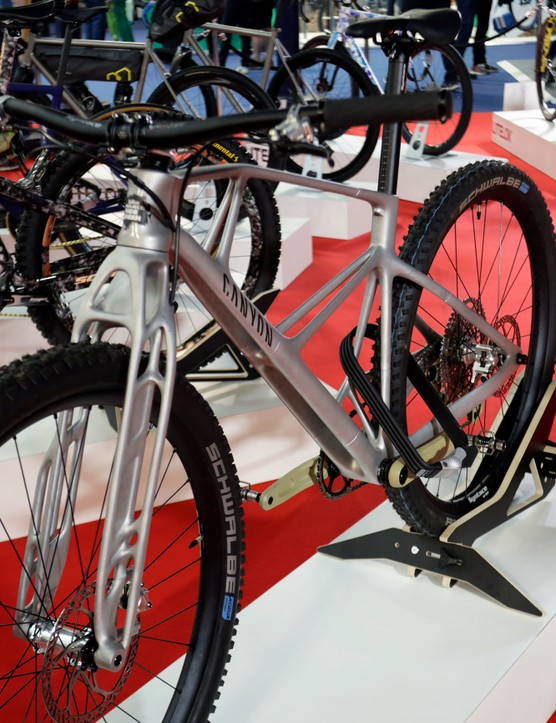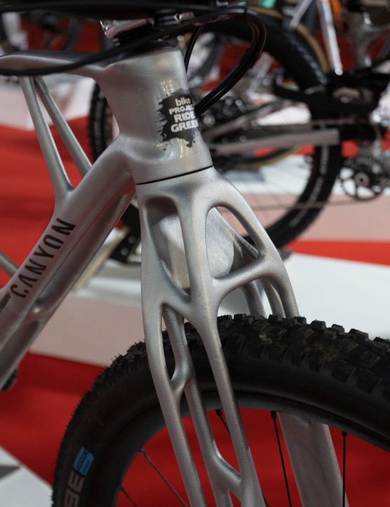 这款来自Canyon的3D打印原型车,前叉外形是骨状的。除了上文中提到的展示Pro用的车子,Canyon还在展览上开创了一个特殊项目。