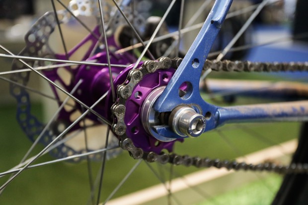 紫色的阳极氧化色花鼓和单速飞轮在阳光下显得格外漂亮,一下子就吸引了笔者的目光,它呗安装在世文的车子上。