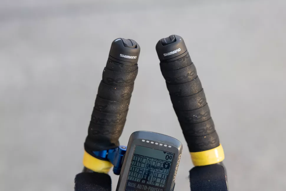 Lachlan Morton的Cannondale在休息把上安装了码表架,在前端有变速按钮。