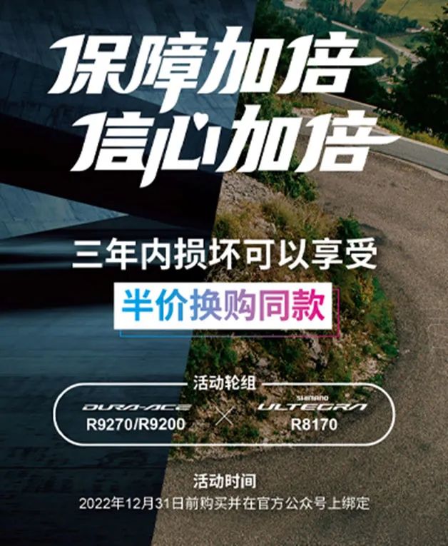 为了更好的服务消费者,即日起至2022年12月31日,前往指定的授权经销商购买指定新款Dura-Ace与Ultegra轮组,并在禧玛诺公众号完成绑定。绑定之日起三年内,活动产品因个人使用原因损坏,即可半价换购同款产品。