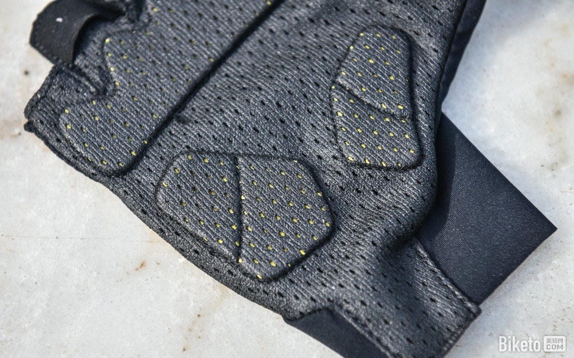掌心使用大面积缓冲垫布局,这垫子面积着实夸张,难怪宝贝标题写着“山地车减震手套”……黄色垫子的材质比较有意思,不是传统的海绵或硅胶,而是类似摩托车护具和鞋垫用的慢回弹聚氨酯泡棉材质。而垫子的供应商则是减震材料一霸PORON。