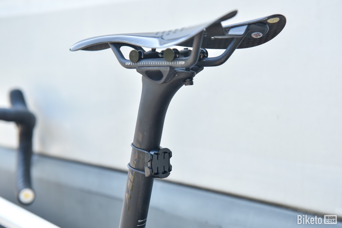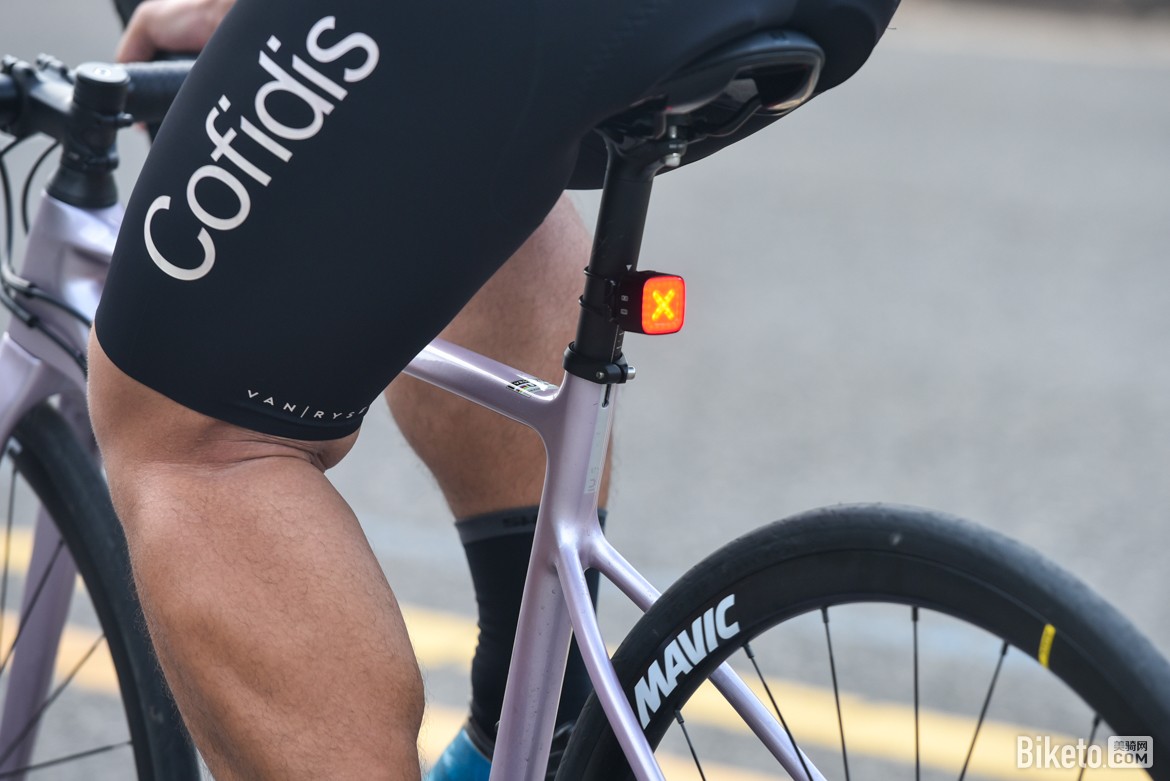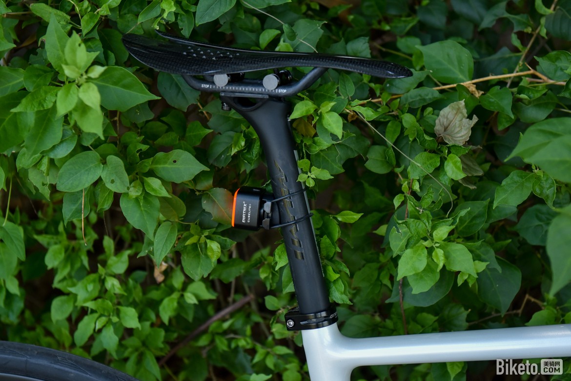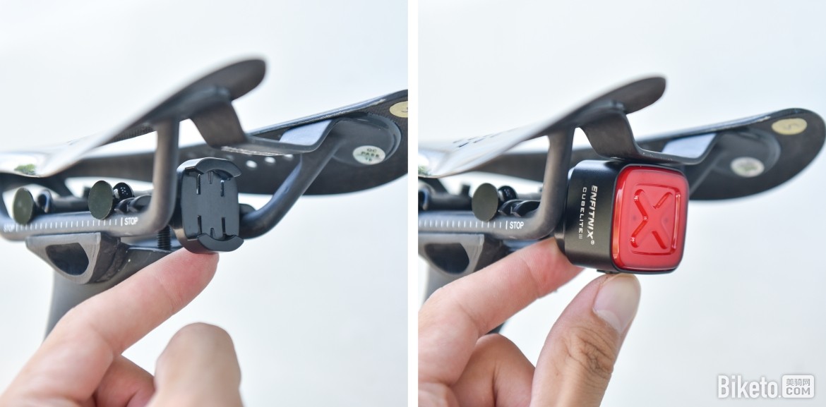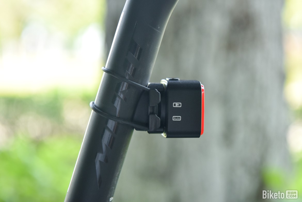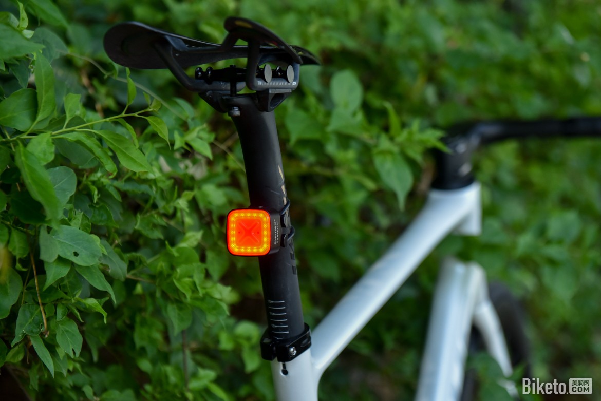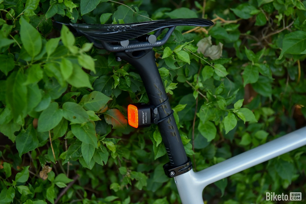CubeliteIII有两种安装方式,一种是安装在坐垫导轨后方,装得高照得远,骑车时屁股下闪闪发光总是更引人注目。但如果像图中这样导轨长度不够或坐垫造型奇特,就有可能无法安装,只能装在座管上。