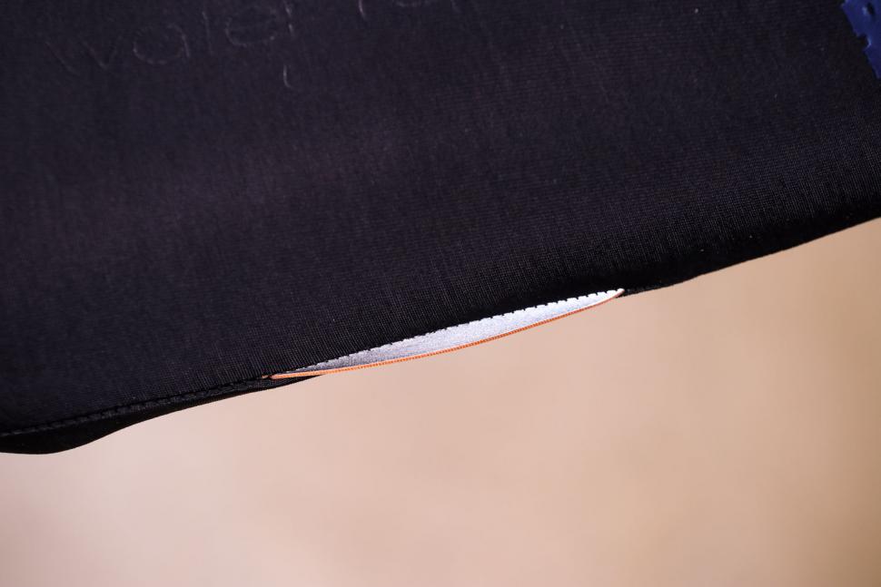 与大多数友商产品不同,Assos Evo 7的上臂位置采用左右不同设计,以特殊角度剪裁以覆盖三头肌处的皮肤。由于其采用左右不同设计,在骑行时分辨并穿戴起来有点麻烦。穿戴时首先需要找到标签分辨左右,这需要把注意力从前方道路上移开。