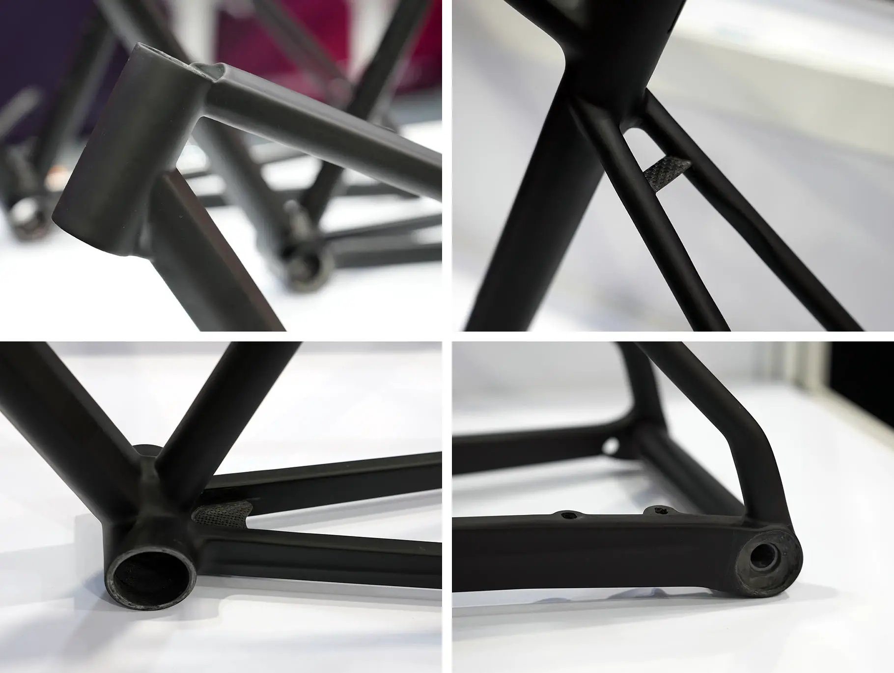 前三角形使用低头管,留有部分凹陷可以让前叉垫圈看起来更加整洁,上管和下管的管型经过特殊设计来增加扭转刚度,圆形五通可以根据客户需要来制作成68毫米或86毫米宽。如图所示,它是100%的碳纤维制造,没有金属零件,尾钩也是中空碳纤维。