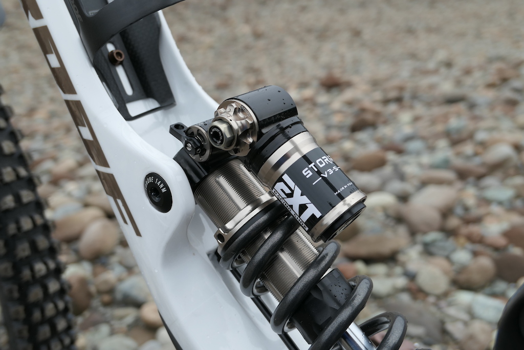Nukeproof Giga297带有EXT Storia等高端后避震器。为了达到180mm的行程,Giga配备了205x65的Trunnion mount规格避震,但我恳请EXT加拿大的经销商能否增加5mm的行程垫片以减少行程,毕竟使用液压机构防止打底,且Giga车架非常先进,所以我不担心打底带来的问题。我选择了一个500磅/英寸的弹簧,预紧力为1.5圈,根据骑行路况和线路,回弹设置为-5或-6,在压缩端,LSC也是-5或-6,HSC是-7。