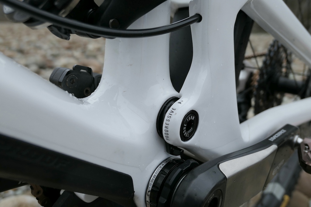 后三角的内侧,带棱纹的橡胶条很好地保护了漆面不受链条跳动影响。前三角的下管也有一个,不过我们希望还能添加后挡板比较好。虽然我喜欢夏天在SeatoSky区域骑行,这个时间非常适合进入自行车公园,也非常适合这台车,但180mm的行程对于冬天低海拔的小路来说还是太过“超级”了,所以我想有的时候行程需要调整、削减。