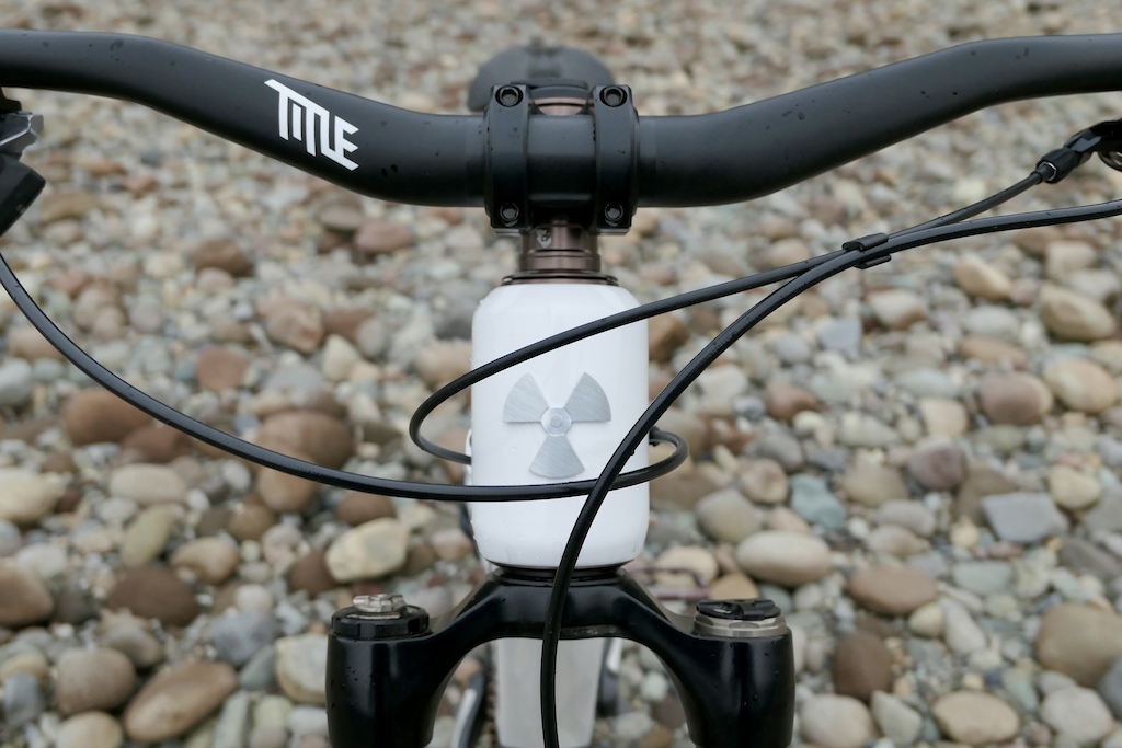 变速线、刹车线的走线沿着头管侧面走成一条直线,在后避震下部穿过,在车架上没有任何不必要的接触,非常干净整洁。在上管下方,有一个支架附件,会根据外出情况可以安装气泵、工具等;为了方便在下管上部安装水壶,Nukeproof重新设计了下管形状,可以将水壶固定在前三角中,当然这个设计也是在去年的款式下改款的。