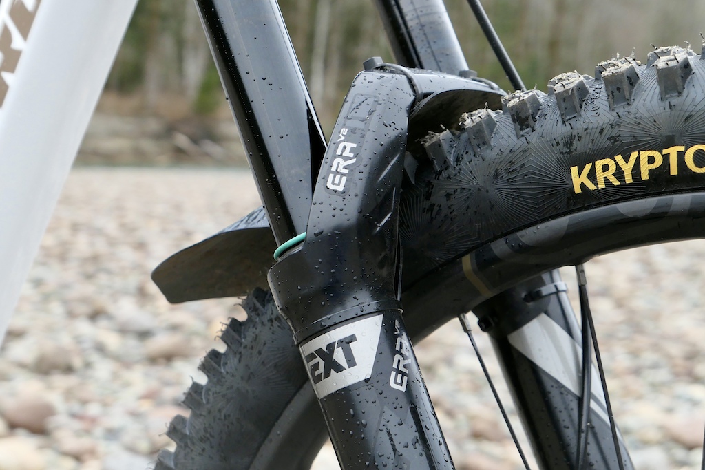 这是EXT Era和Ohlins的RXF38之间争夺我目前最喜欢前叉的战斗。两者都使用两个正气室,可以微调弹簧刚性和级数,在受到避震冲击之前,我更喜欢将避震调至最硬来提供必要的支撑。虽然原装车架需要要180毫米行程的前叉,但我还是使用了170毫米的Era和3毫米高的Cane Creek底档,因为意大利前叉的底档尺寸比大多数前叉更长。