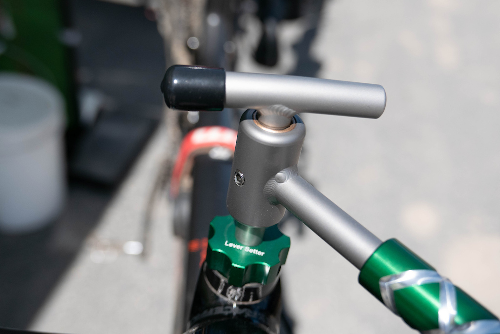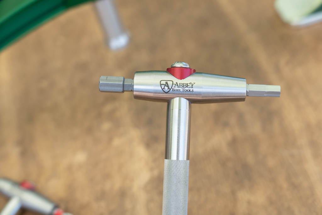 来自美国的“殿堂级”工具品牌Abbey Bike Tools推出了这款指拨调节工具,它的一头旋入把立螺丝内,然后用另一头测量和调节把横左右两边指拨的位置,让它们与把立的距离相等。