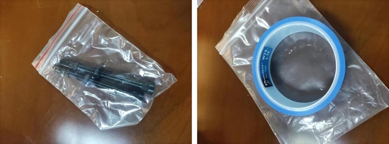 包装是五层瓦楞纸盒,从包装里轻松取出前45mm后50mm框高的轮组,包装里除了轮组还有中英文说明书,随箱附赠了真空气嘴和真空胎垫。