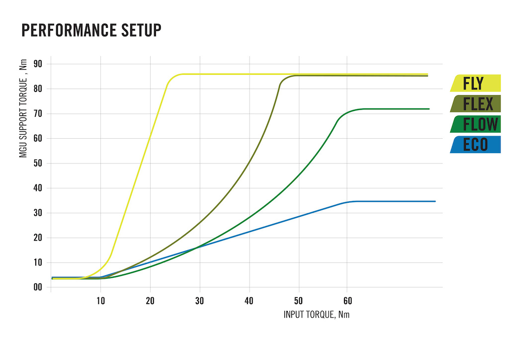 目前,Pinion全套E-Drive系统支持Eco(节能)、Flow(平顺)、Flex(灵活)和Fly(高性能)四种驱动模式。Eco(节能)模式为达到最大的骑行距离而设计,与之对应的Fly(高性能)模式则能提供最高的功率输出。Flow(平顺)和Flex(灵活)模式是自适应骑行模式,具备较强的动态性,能够根据车手的不同情况和功率输出、骑行地形自动调整输出功率。