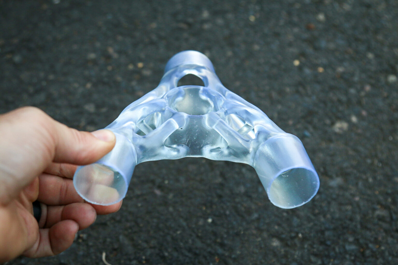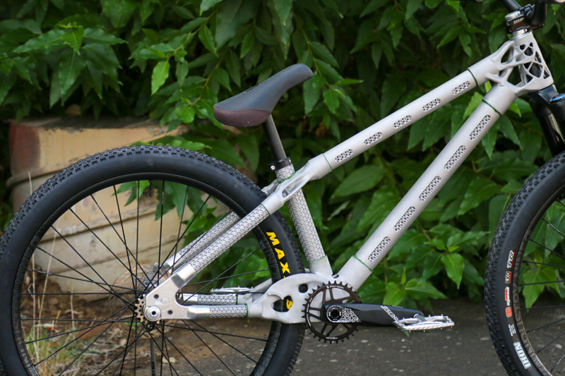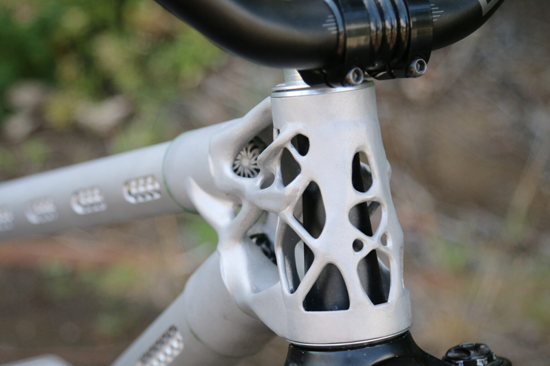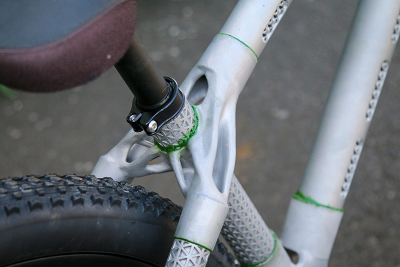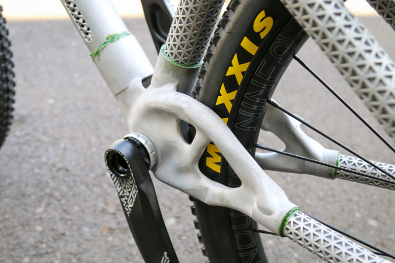 相较于无法骑行的概念验证车架,本次迪伦打造了真正可骑乘的车架。新车架摒弃了碳纤维管与尼龙12接合件的组合,几乎完全采用铝合金3D打印成型。