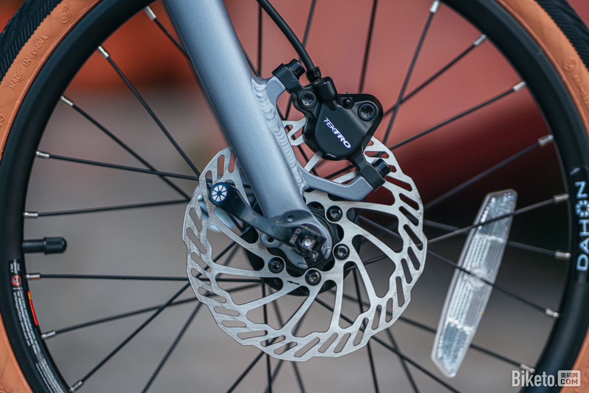 相较于传统车型P10,MU P9不仅车架设计更紧凑,还适应当下技术趋势,升级为前后油压碟刹,刹车性能更稳定,恶劣天气下表现也更好。另外为了避免干扰折叠,前轮碟刹置于轮组右侧,保证制动性能的同时,进一步缩小折叠体积。