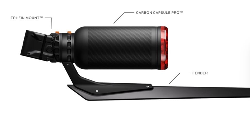 PakBrite 表示,传统存储装置"经常遮挡或降低尾灯的位置,但 Carbon Capsule Pro 将照明置于高位且无遮挡,从而提供卓越的安全性。结合 Tri-Fin Mount车灯,骑手可获得空气动力学效率和不受影响的可见度的双重好处。"