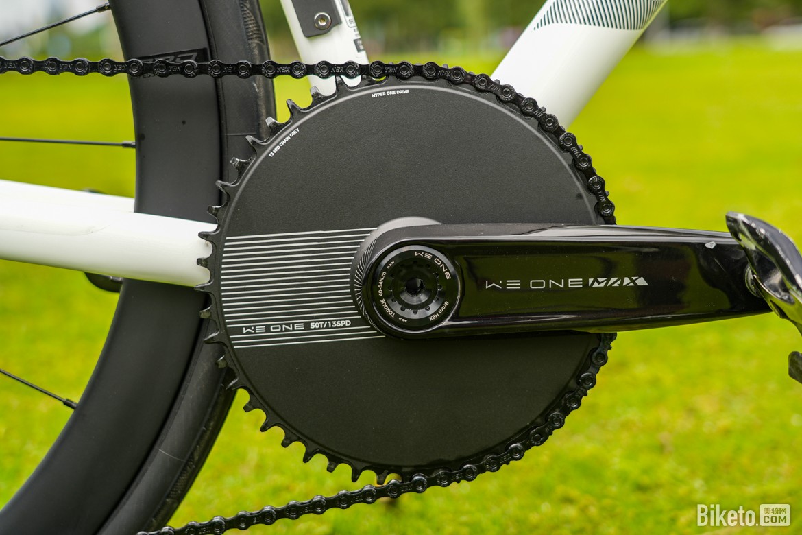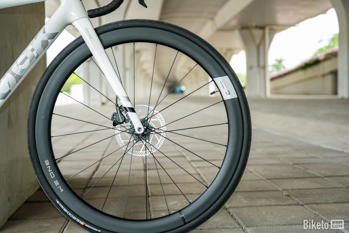 轮组为VOOK自家的WE ONE PRO 45入门碳轮,轮圈使用目前主流28mm外宽、21mm内宽设定,框高设定为比较百搭的45mm,甚至花鼓都是行星棘轮结构的。轮组重量为1480克,为整车的轻量化做出不少贡献。