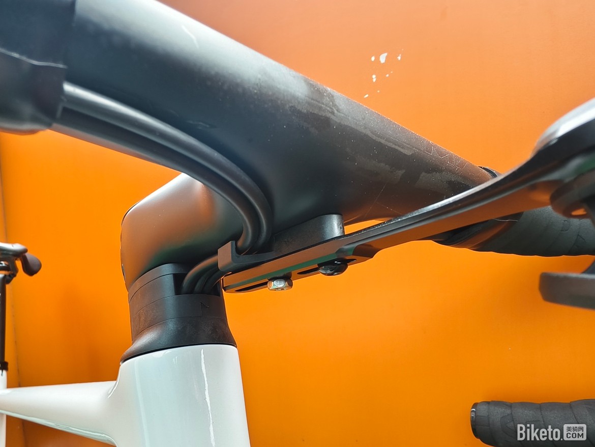 由于是外走线设计,所以车把下放设置了一个收线夹,来保证管线规整。但这就意味着需要和码表架共享孔位,安装码表架时螺丝会不够长。并且整车并没有附带码表架,建议后续搭配码表架出货。