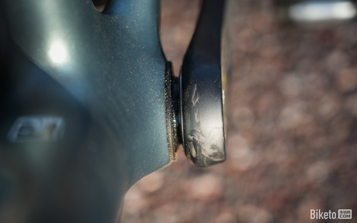 左侧曲柄的钛合金嵌件造型与右侧相呼应,并且巧妙地整合了预压环功能,想必设计这款曲柄的小伙伴花了不少心思。