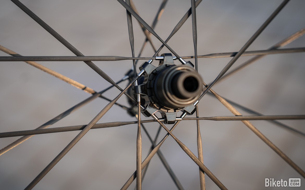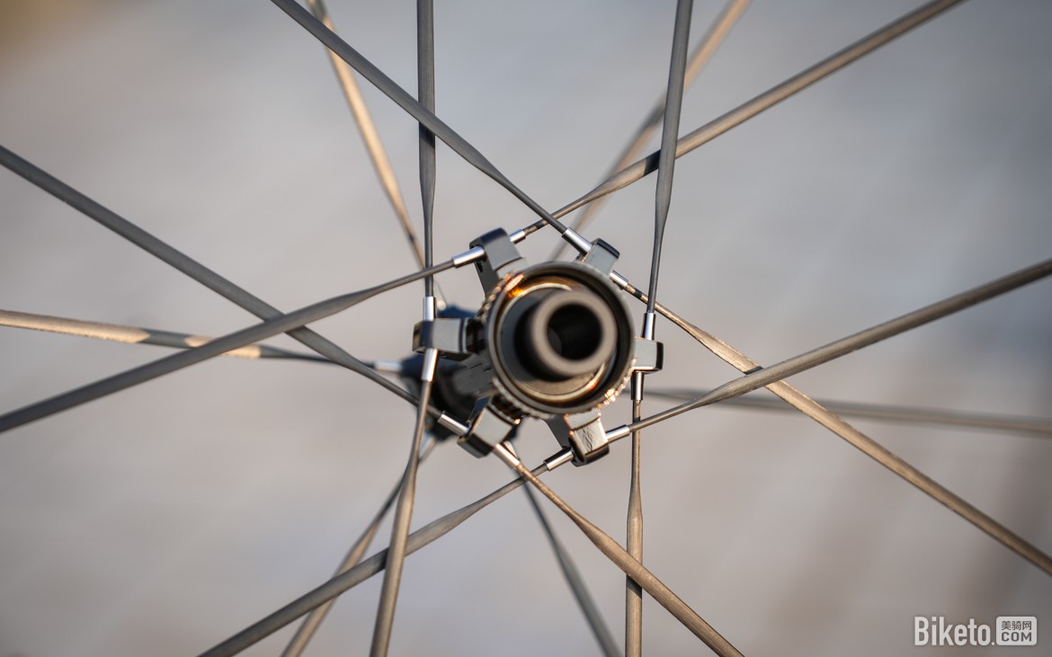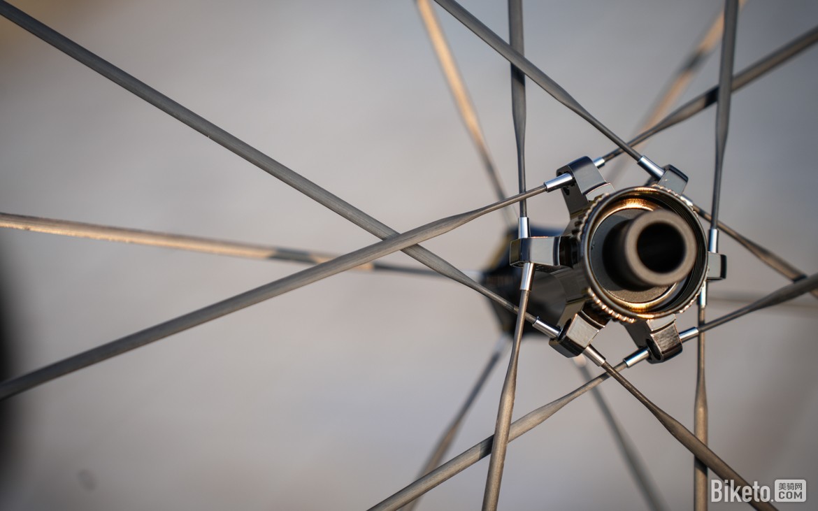 辐条则同为来自Arris的特规碳辐条,规格约为4.0mm x 1.0mm,辐条两端的接头均为钛合金材质。又窄又薄的碳辐条可以同时兼顾轻量化和低风阻。辐条张力与CLX3一样,同为低张力设定。