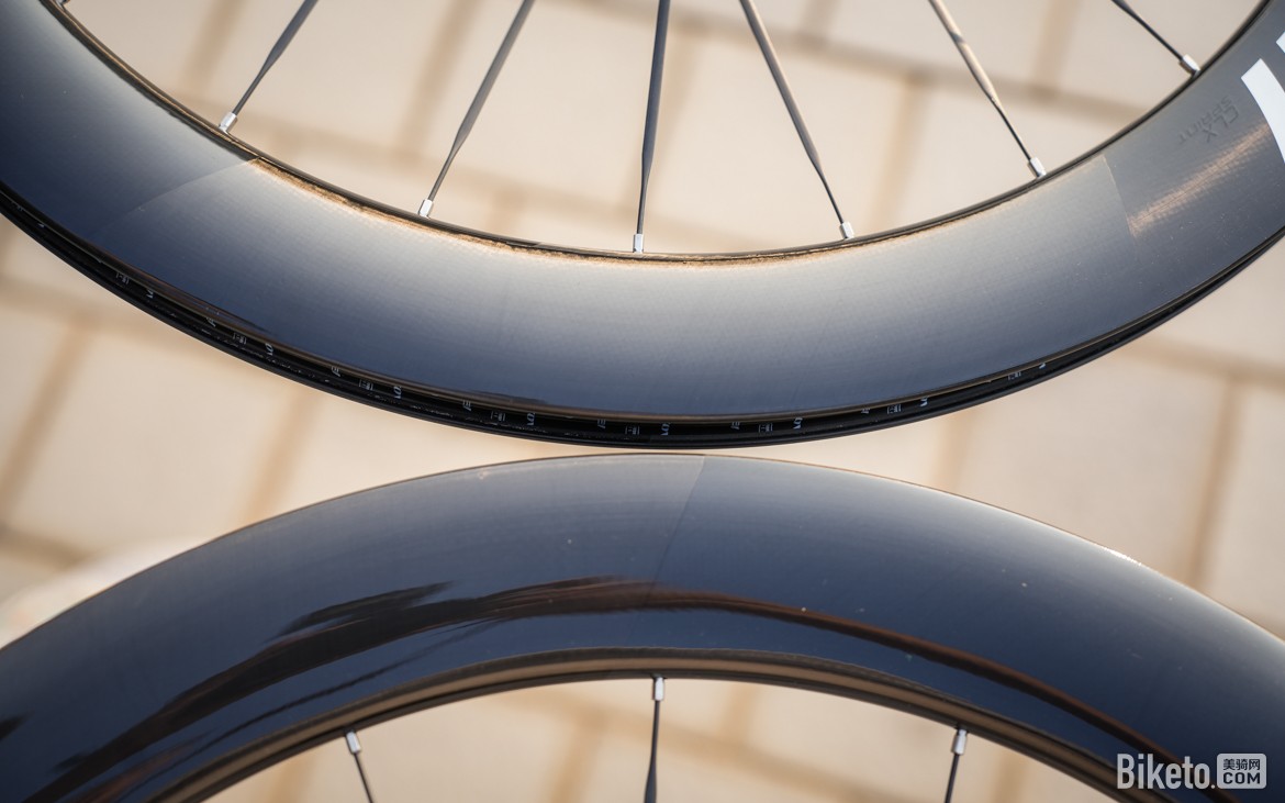 CLX SPRINT的前轮框高为63mm、后轮框高为58mm,视觉上差异非常明显。前轮使用更高的框高可以带来更好的气动效果,而后轮降低框高则可以减轻重量。