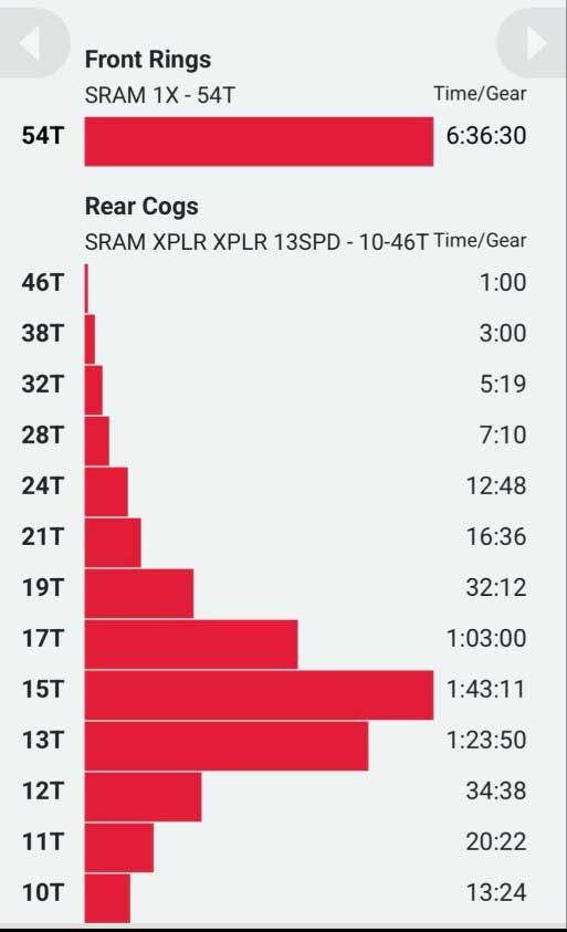 数据显示,中央链轮,尤其是15T、13T和17T,这些部件占据了大部分踩踏时间(超过4小时,比赛近6小时半)。