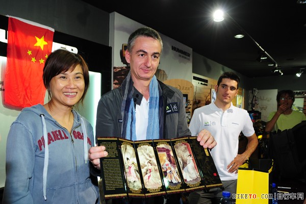 昨日下午2时,由Pinarello中国总代美尼亚贸易(深圳)有限公司为车友安排的移动之星车队(Movistar)签名会在北京市崇文区金牌自行车极品店举行。参与本届环京赛的Juanjo Cobo等移动之星车手亲临现场为粉丝签名,以回馈车友的支持。