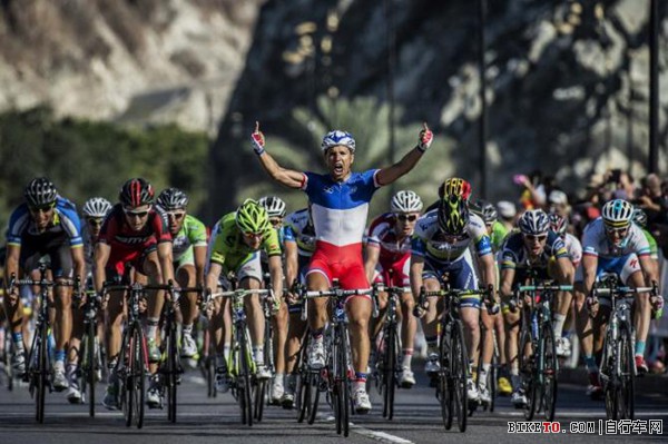 六天的环阿曼自行车赛来到了最后一个赛段。这个平路赛段与很多环赛的最后一个赛段一样,已经很难对GC座次产生影响了。但这也给了冲刺手最后的获胜良机。这一次,在终点线前庆祝胜利的是法国国家冠军Nacer Bouhanni。来自FDJ车队的他穿着象征国家冠军的蓝白红相间骑行服格外显眼。