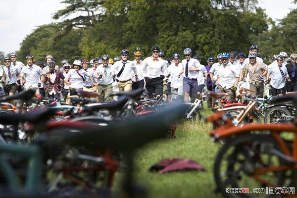 这帮标准的绅士们要先小跑一段,迅速打开折叠好的Brompton,然后开始骑行比赛