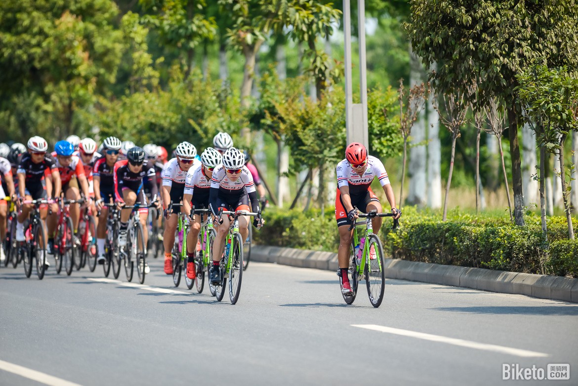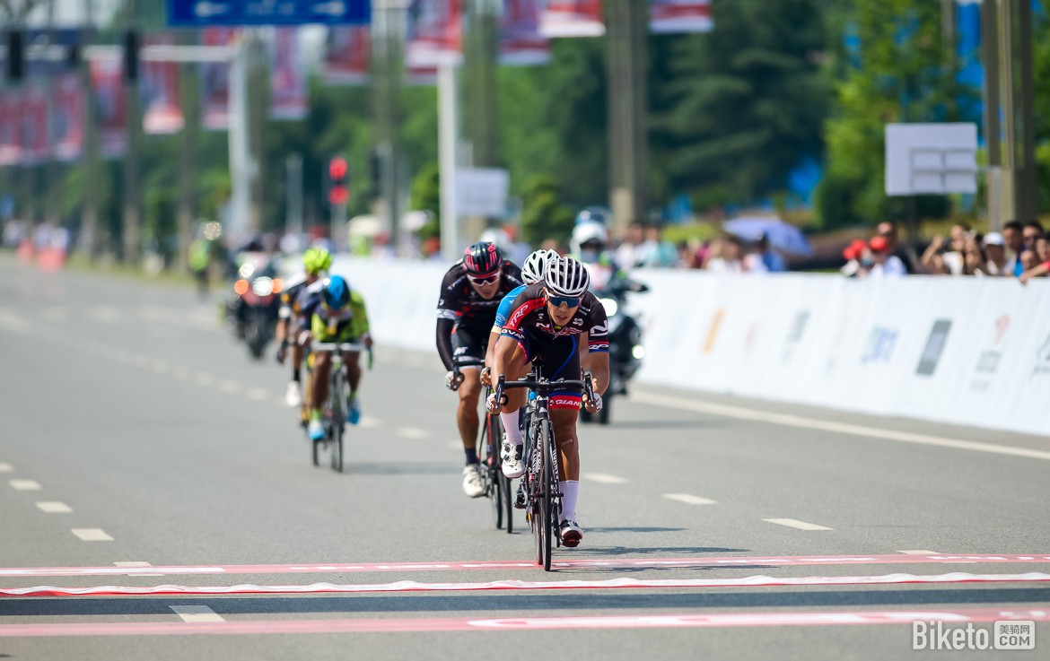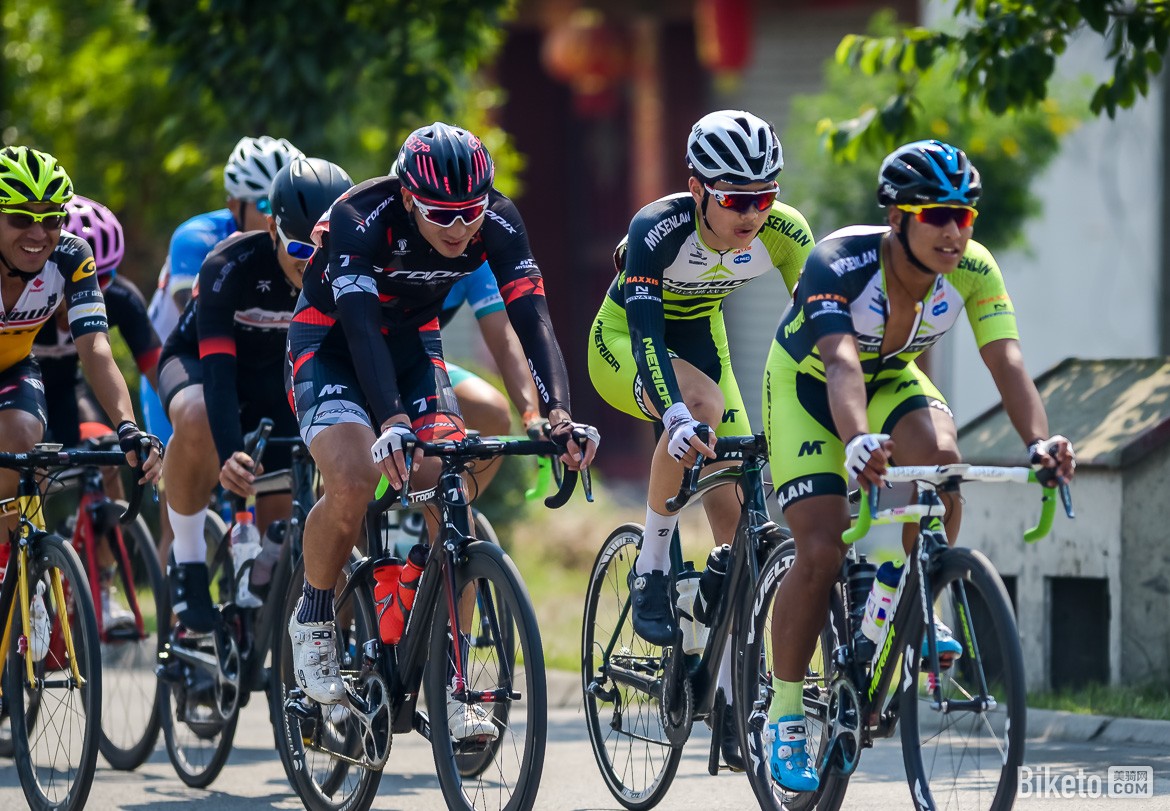 此时,身后的大集团在森地客鑫元鸿车队强大的追击下迅速缩小差距。这个时候人数优势就体现出来了,森地客鑫元鸿车队7人参赛,除开主将胡浩,前面一直保持3-4人的追击集团。这其中领骑最多的应该是吴云飞,他的强大TT能力派上用场。期间我们看到了,赵贵宝,魏魁和夏威分别在车队退下一人的时候顶上来参与追击。小编当时的心里只想说:兵强马壮就是好,人数优势体现的淋漓尽致。比赛在进入最后10公里后追回突围集团,森地客鑫元鸿车队继续控制大集团速度,目的就是不让其车队有机会发动新一轮的进攻,确保大集团回去冲刺,这样保护胡浩个人总成绩和团体总成绩双料冠军。