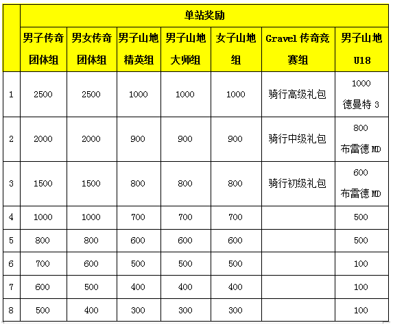 ①个人(男子山地精英组、男子山地大师组、女子山地组)分站成绩排名奖励前30名,Gravel传奇竞赛组分站成绩排名奖励前3名,比赛为大组出发,比赛用时少者优胜。
