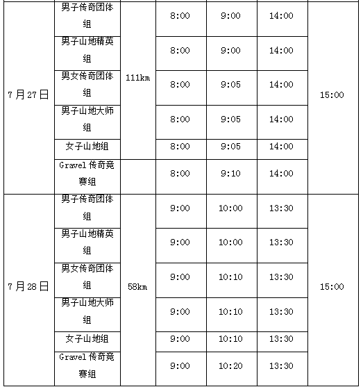 2.竞赛组(男子传奇团体组、男女传奇团体组、男子山地精英组、男子山地大师组、女子山地组、Gravel传奇竞赛组)设置关门时间为第1名完赛时间的30%,裁判长有权根据赛事具体情况适当延长或者减短关门时间。