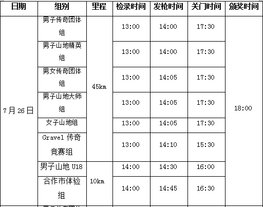 1.体验组、男子山地U18组关门时间为1小时。