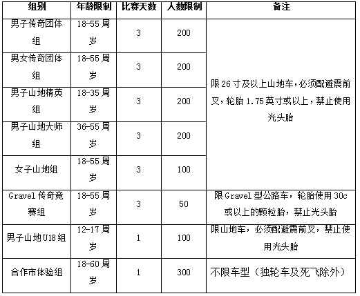 1.体验组选手不限车型(独轮车及固定齿轮自行车(死飞)除外),但须确保车辆没有安全隐患,Gravel传奇竞赛组比赛用车必须为Gravel型公路车,轮胎使用30c或以上的颗粒胎,禁止光头胎。其他参赛组别比赛用车必须为26寸及以上山地车,并配避震前叉,轮胎1.75英寸或以上,禁止光头胎。