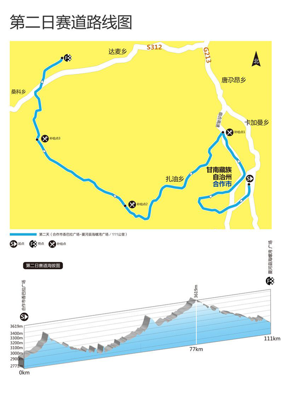 Day2:次日,111km的赛道成为考验选手耐力的拉力赛。选手们会途径甘南著名风景名胜区桑科草原和拉卜楞寺,感受甘南的藏地民俗风情。距离是今天的亮点,100多公里的路程需要经过2个垭口,最高海拔达到了3600+,路途中有砂石路面、有水泥乡道、有自由选择路线的草地,还有一部分柏油路,连接合作市与夏河。