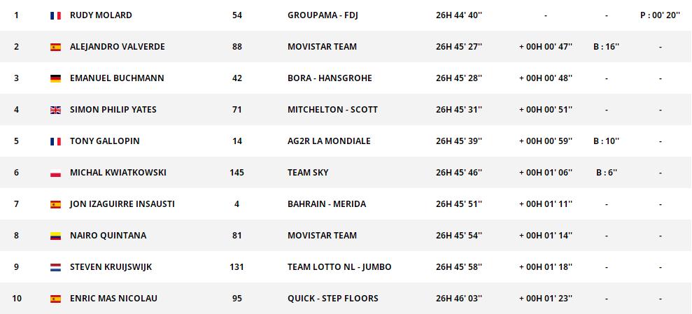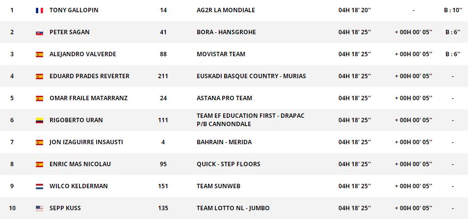 五秒之后小集团抵达终点,萨甘(博拉-汉斯格雅)抢在巴尔维德(移动之星)之前冲线。莫拉尔(安盟-FDJ)跟着集团过线保有红衫;曾经离他最近的科维亚特科夫斯基则损失了30秒,总成绩滑落到第六,并将绿衫和白衫让给了巴尔维德。