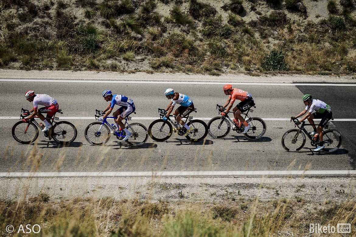 古雅尔(AG2R)和罗塞托(科菲迪斯)一出发就跑掉;维尼奥夫斯基(CCC)、巴克(岱凯)和欧塞林(道达尔-直接能源)随后加入。虽然五人在突围时没有遇到太多阻力,但大集团把差距严控在两分钟出头。积极领骑的古雅尔获得敢斗奖。