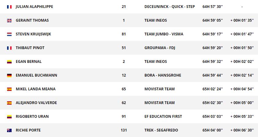 平路赛段过后,几件领骑衫得主均无变动,依然是阿拉菲利普(德库尼克-快步)、萨甘(博拉-汉斯格雅)、韦伦斯(乐透-速的奥)和贝尔纳尔(英力士)。